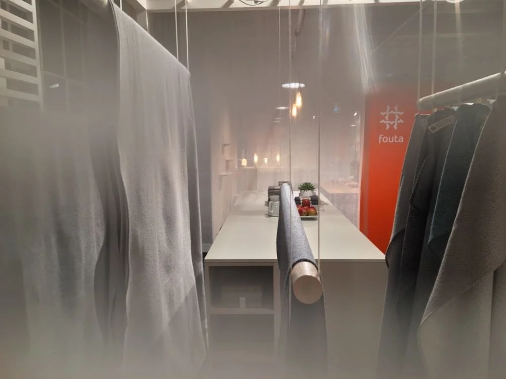 Der temporäre Stand übersetzte die Leichtigkeit der Fouta-Tücher in eine architektonische Sprache: Lokale Holzmodule, Duschstangen, Lavabo und textile Schichtungen erinnerten an ein reduziertes Badambiente, in dem das Produkt räumlich in Szene gesetzt wurde. Die Konstruktion war steckbar und wiederverwendbar, die Logistik auf minimale Volumen optimiert. Stauraum für Give-Aways, Personalverpflegung und Prospekte wurde flächenbündig integriert.