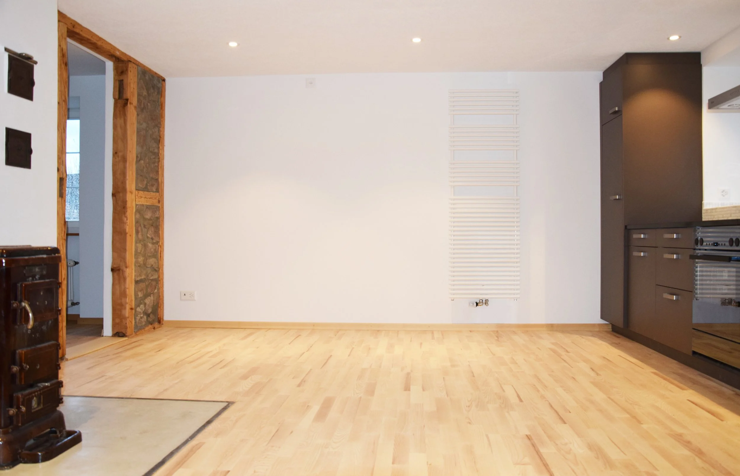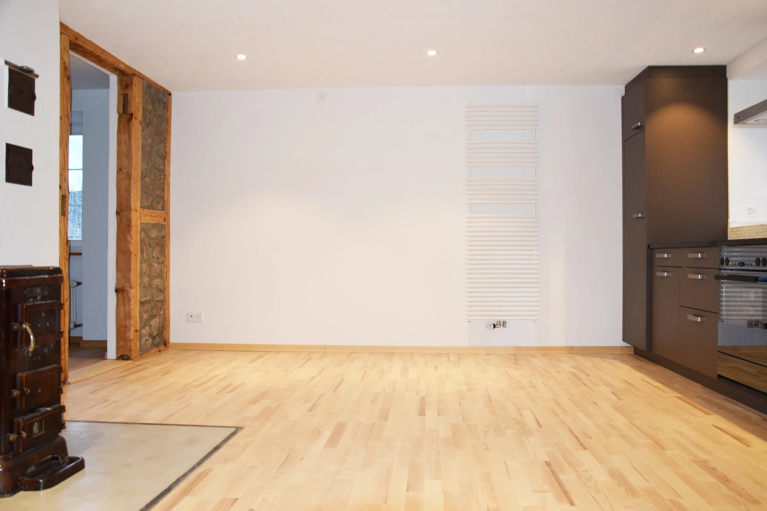 Im Zentrum der Massnahmen stand die Anpassung der Raumstruktur an heutige Wohnbedürfnisse. Die Küche im Obergeschoss wurde komplett erneuert und als offener, funktionaler Raum neu organisiert. Ein erhaltenes Stück Natursteinwand zeugt von der baulichen Geschichte. Von hier gelangt man direkt in ein grosszügiges, lichtdurchflutetes Wohnzimmer, das mit Sprossenfenstern, Holzvertäfelungen und einem klassischen Kachelofen eine warme Wohnatmosphäre erzeugt.