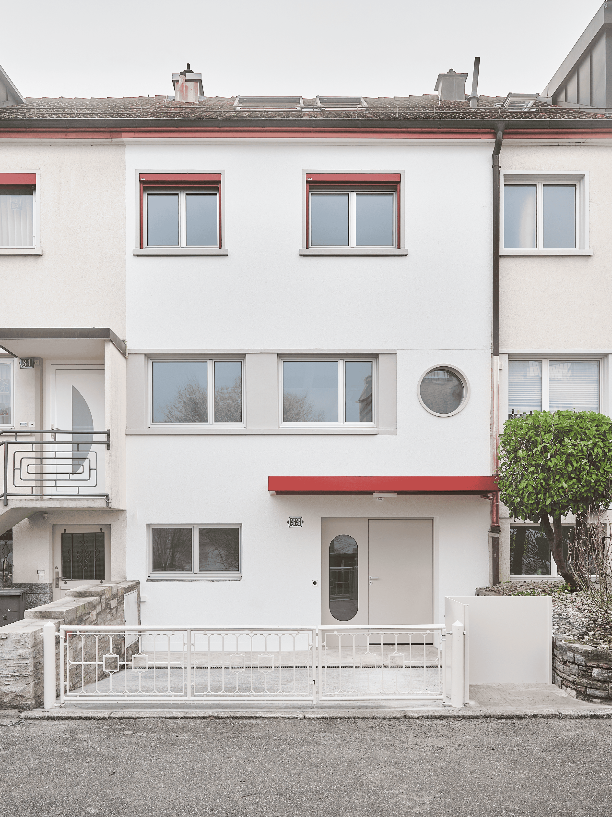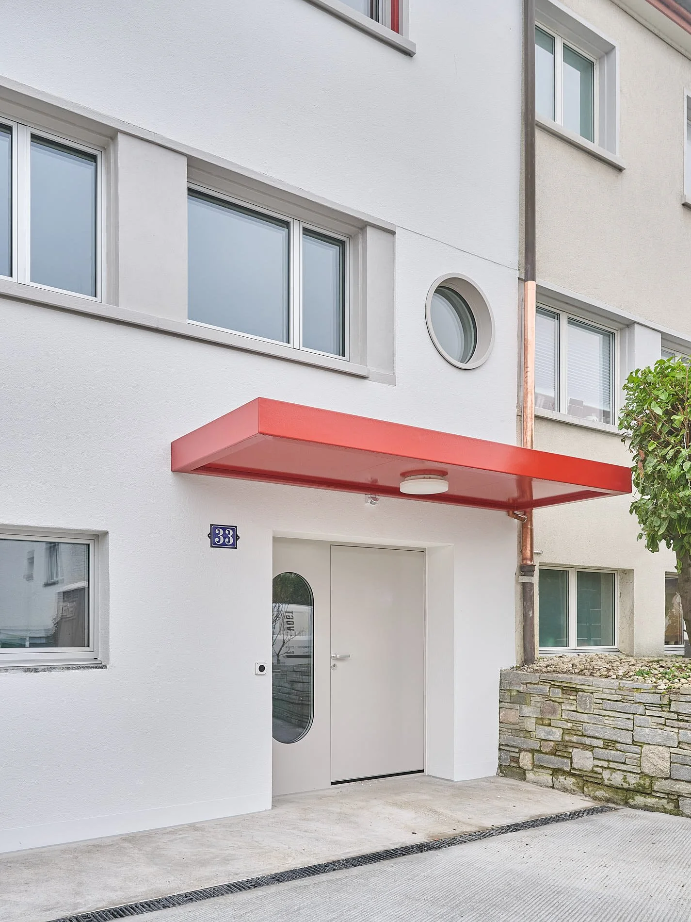 Besonderes Augenmerk gilt der Adressbildung an der Nordseite. Der Haupteingang wird vom bisherigen, aussenliegenden Zugang abgekoppelt und ins Erdgeschoss verlegt. Die frühere Eingangstür bleibt als rundes Fenster in der Fassade ablesbar und markiert die Transformation des Hauses innerhalb der Reihe. Eine auskragende Betonplatte definiert den neuen Eingang. Ein 1.20 m vorspringendes Vordach mit Diagonalstreben nimmt die Linie dieser Platte auf und führt sie als horizontales Motiv über die Fassade weiter.