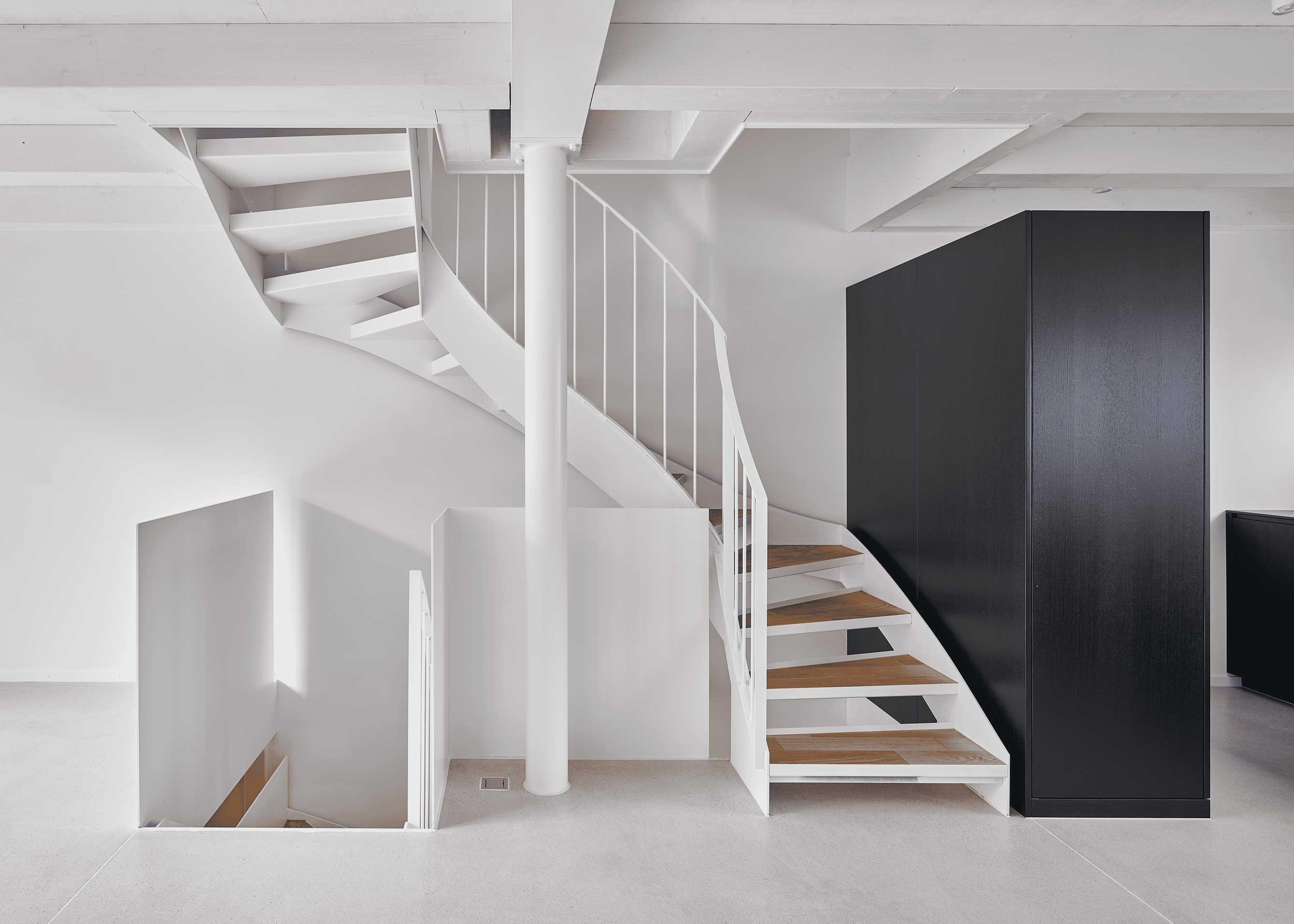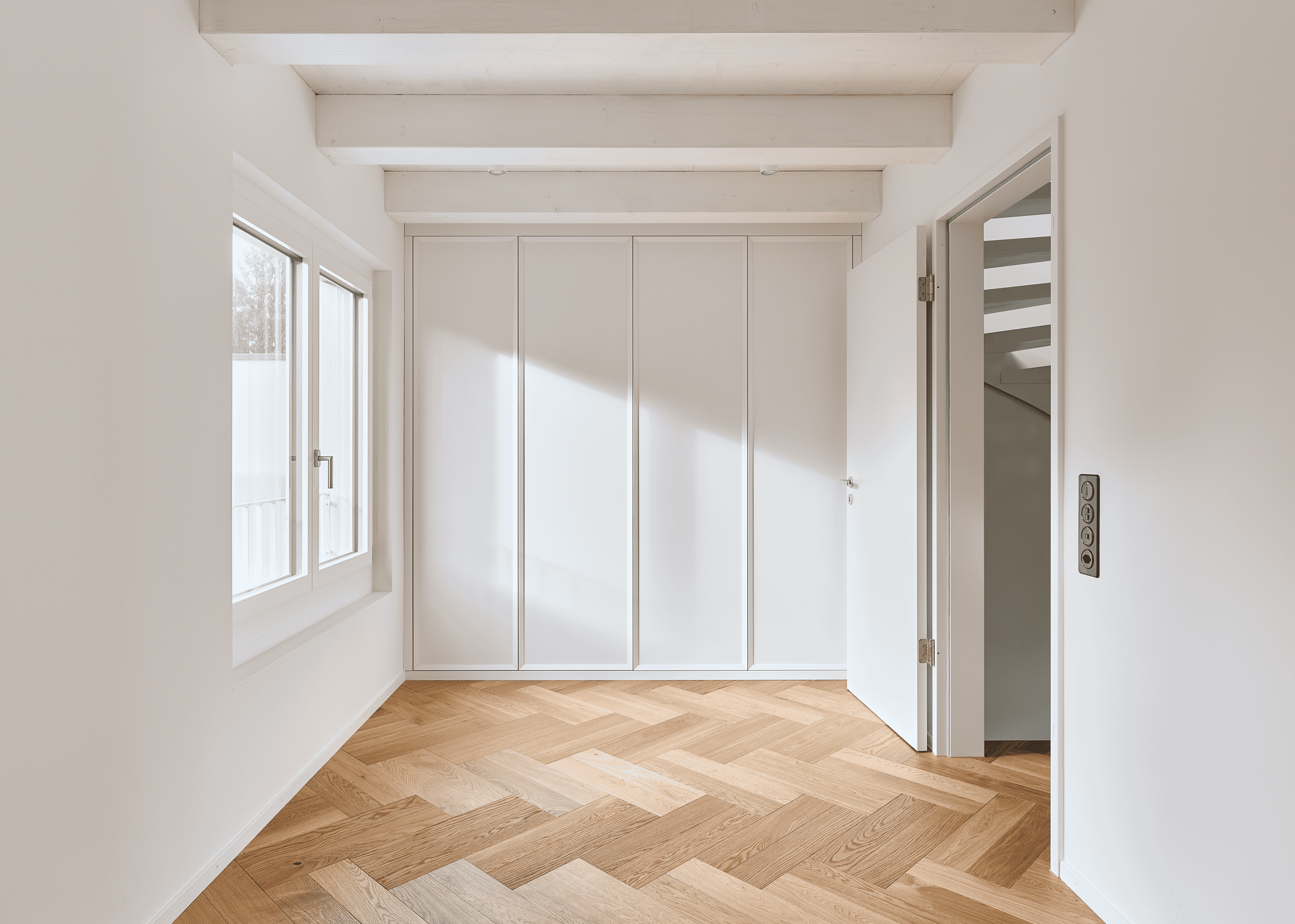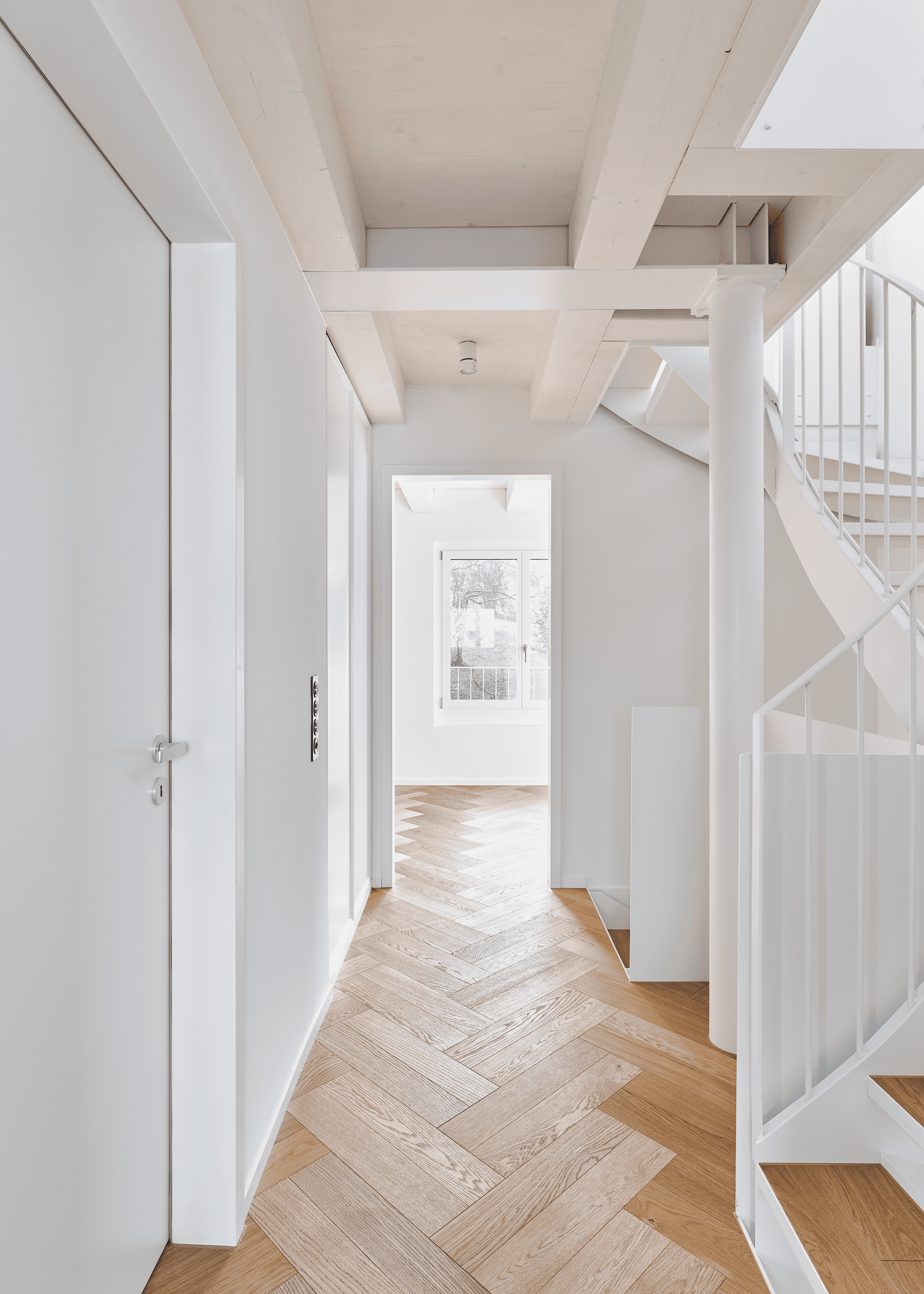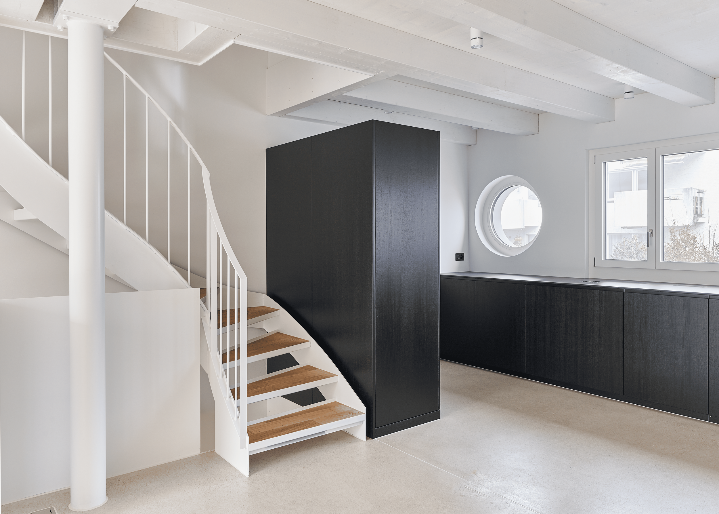 Die innere Organisation wird neu gelesen und entlang heutiger Wohnbedürfnisse präzisiert. Unter-, Erd-, Ober- und Dachgeschoss werden typologisch neu gefasst. Eine einläufige Metalltreppe verbindet den ehemaligen Keller mit den Wohngeschossen und dem ausgebauten Dach und bildet das Rückgrat der vertikalen Erschliessung. Das Dachgeschoss, zuvor nur eingeschränkt nutzbar, wird durch vier neu eingefügte Dachflächenfenster und die klare Anbindung an die übrigen Geschosse zu einem vollwertigen Aufenthaltsbereich mit gleichmässiger Belichtung.