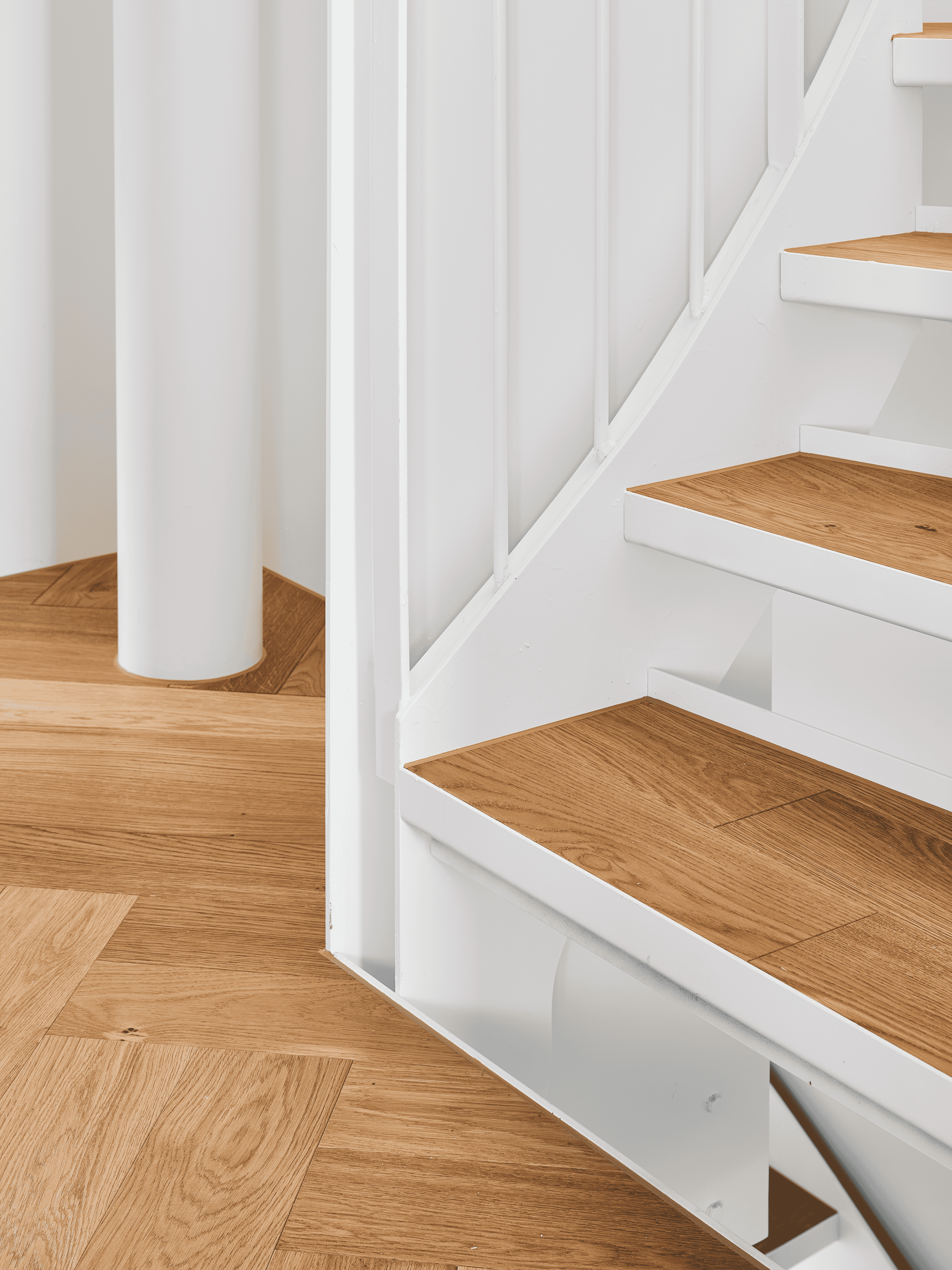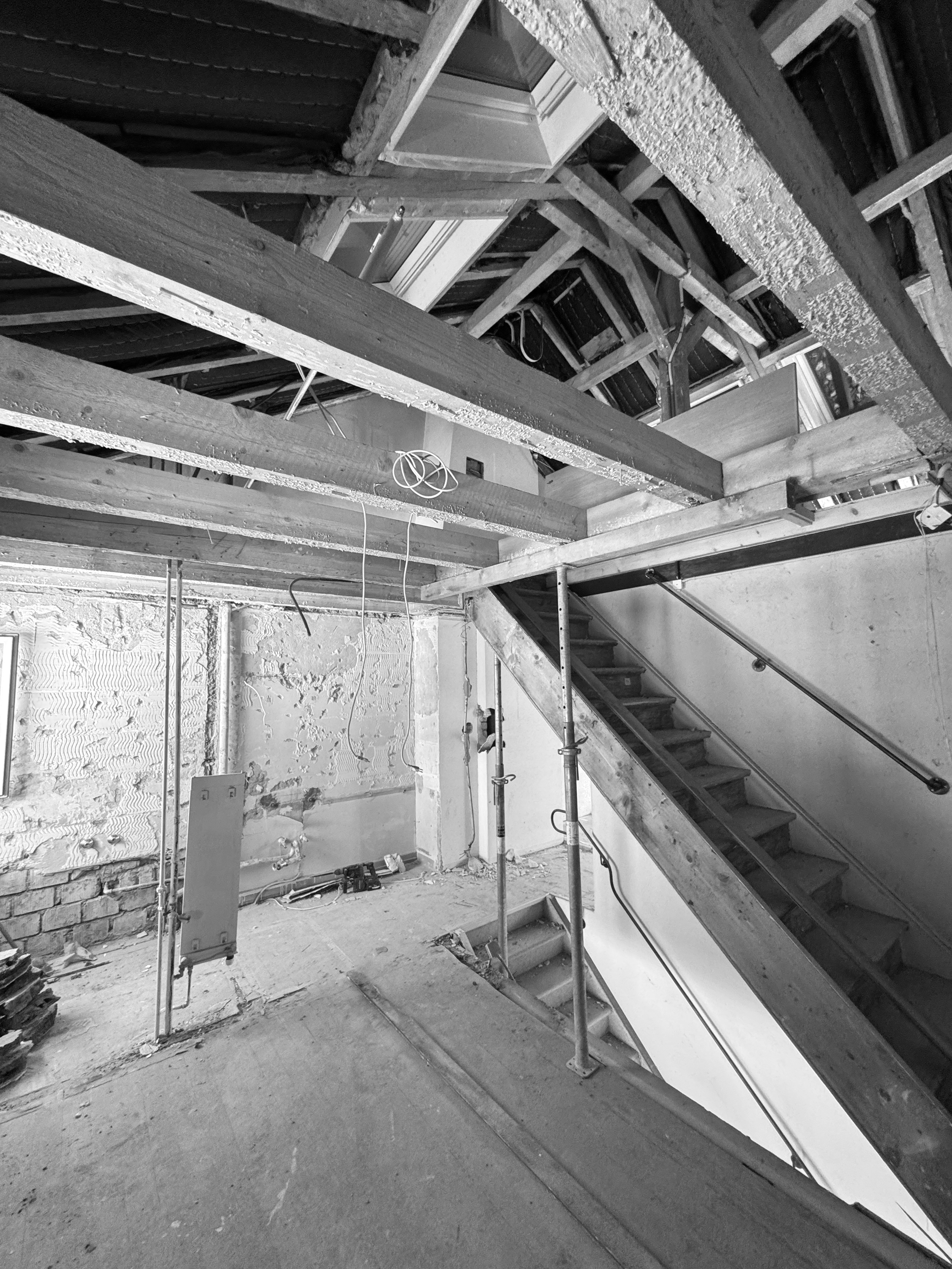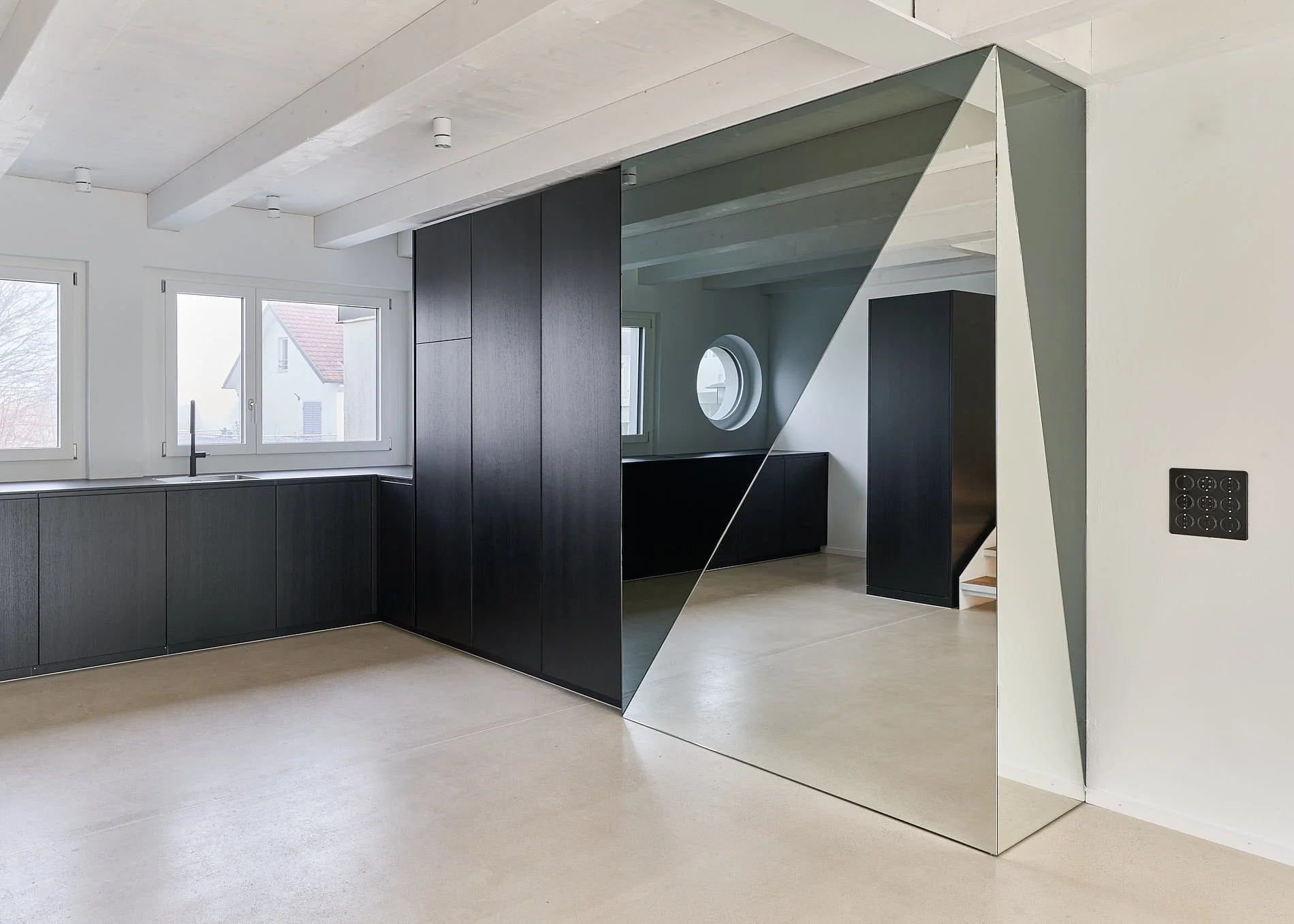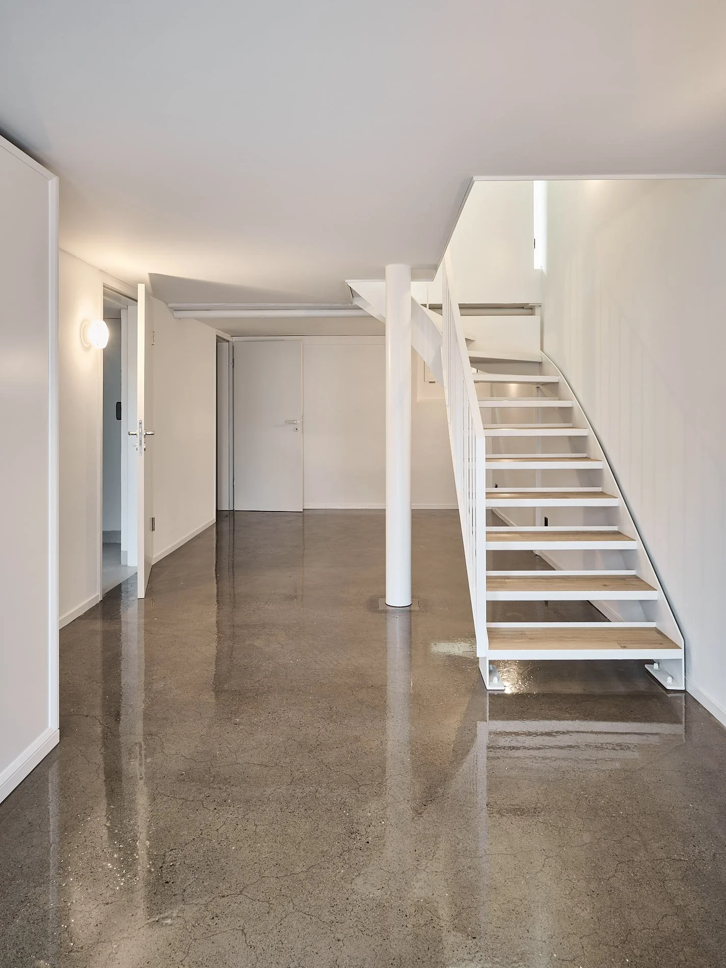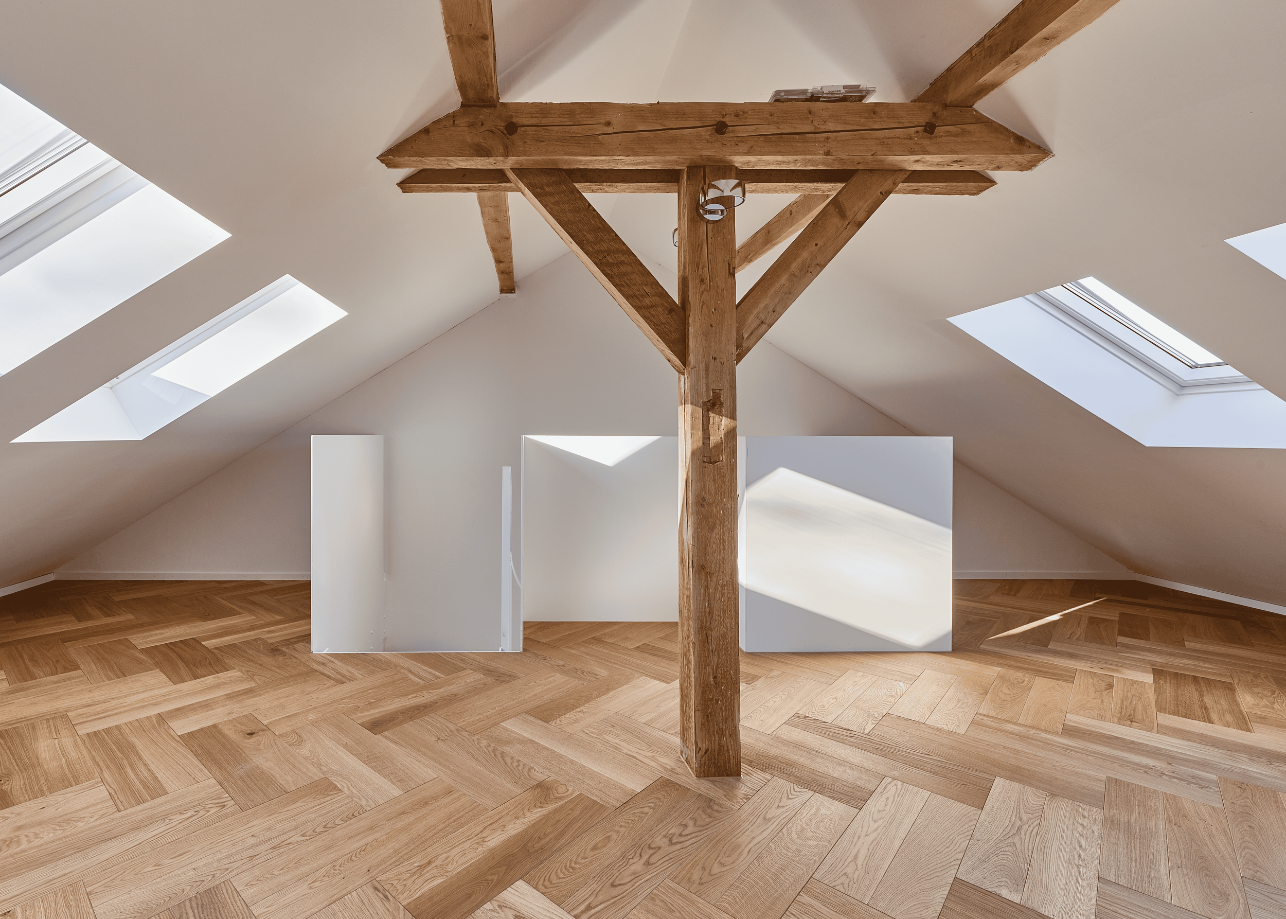 Die innere Organisation wird neu gelesen und entlang heutiger Wohnbedürfnisse präzisiert. Unter-, Erd-, Ober- und Dachgeschoss werden typologisch neu gefasst. Eine einläufige Metalltreppe verbindet den ehemaligen Keller mit den Wohngeschossen und dem ausgebauten Dach und bildet das Rückgrat der vertikalen Erschliessung. Das Dachgeschoss, zuvor nur eingeschränkt nutzbar, wird durch vier neu eingefügte Dachflächenfenster und die klare Anbindung an die übrigen Geschosse zu einem vollwertigen Aufenthaltsbereich mit gleichmässiger Belichtung.