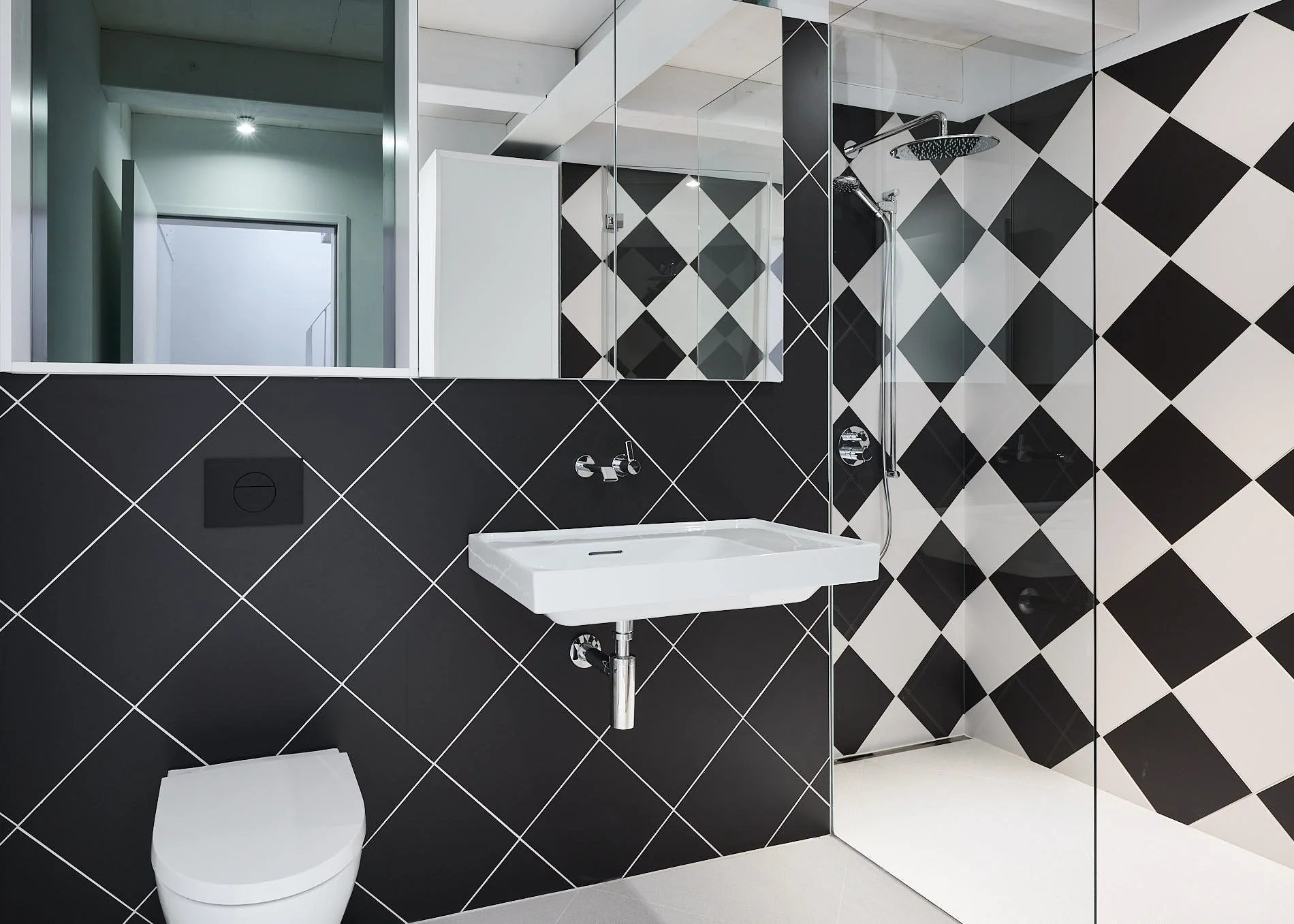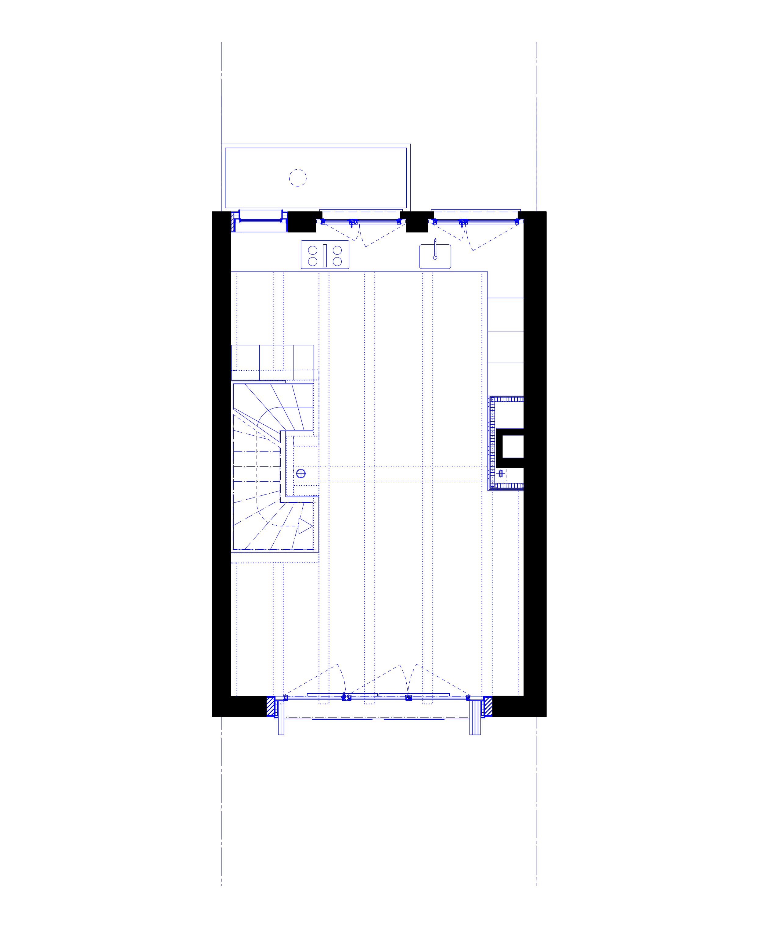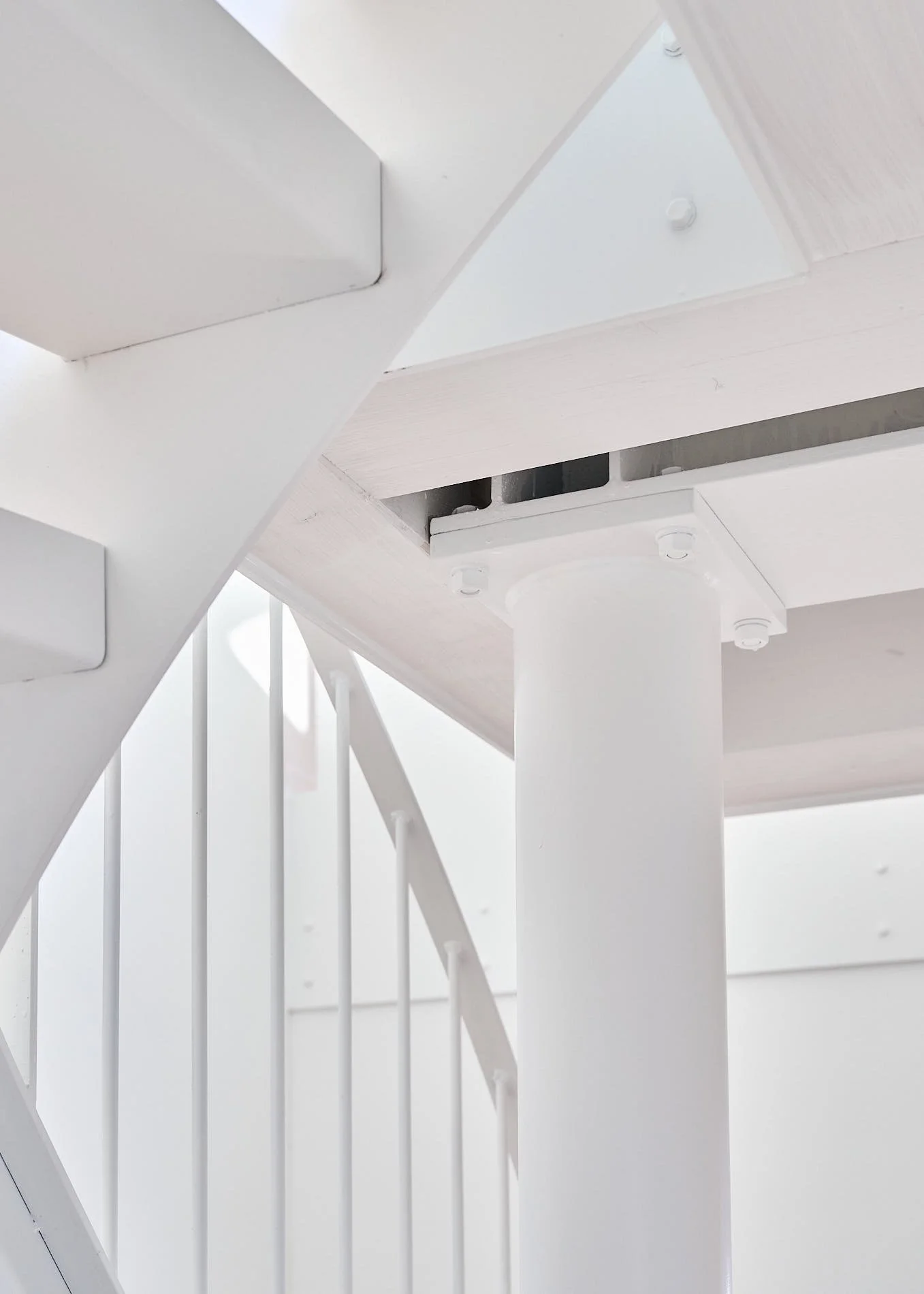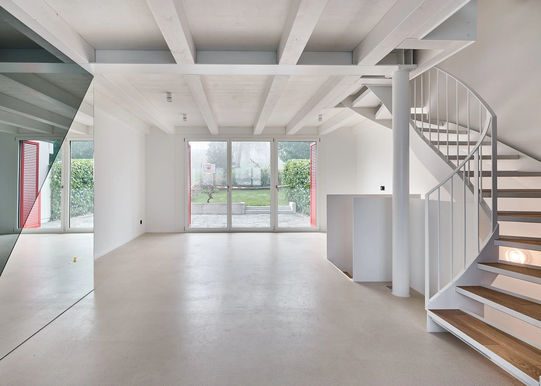 Die innere Organisation wird neu gelesen und entlang heutiger Wohnbedürfnisse präzisiert. Unter-, Erd-, Ober- und Dachgeschoss werden typologisch neu gefasst. Eine einläufige Metalltreppe verbindet den ehemaligen Keller mit den Wohngeschossen und dem ausgebauten Dach und bildet das Rückgrat der vertikalen Erschliessung. Das Dachgeschoss, zuvor nur eingeschränkt nutzbar, wird durch vier neu eingefügte Dachflächenfenster und die klare Anbindung an die übrigen Geschosse zu einem vollwertigen Aufenthaltsbereich mit gleichmässiger Belichtung.