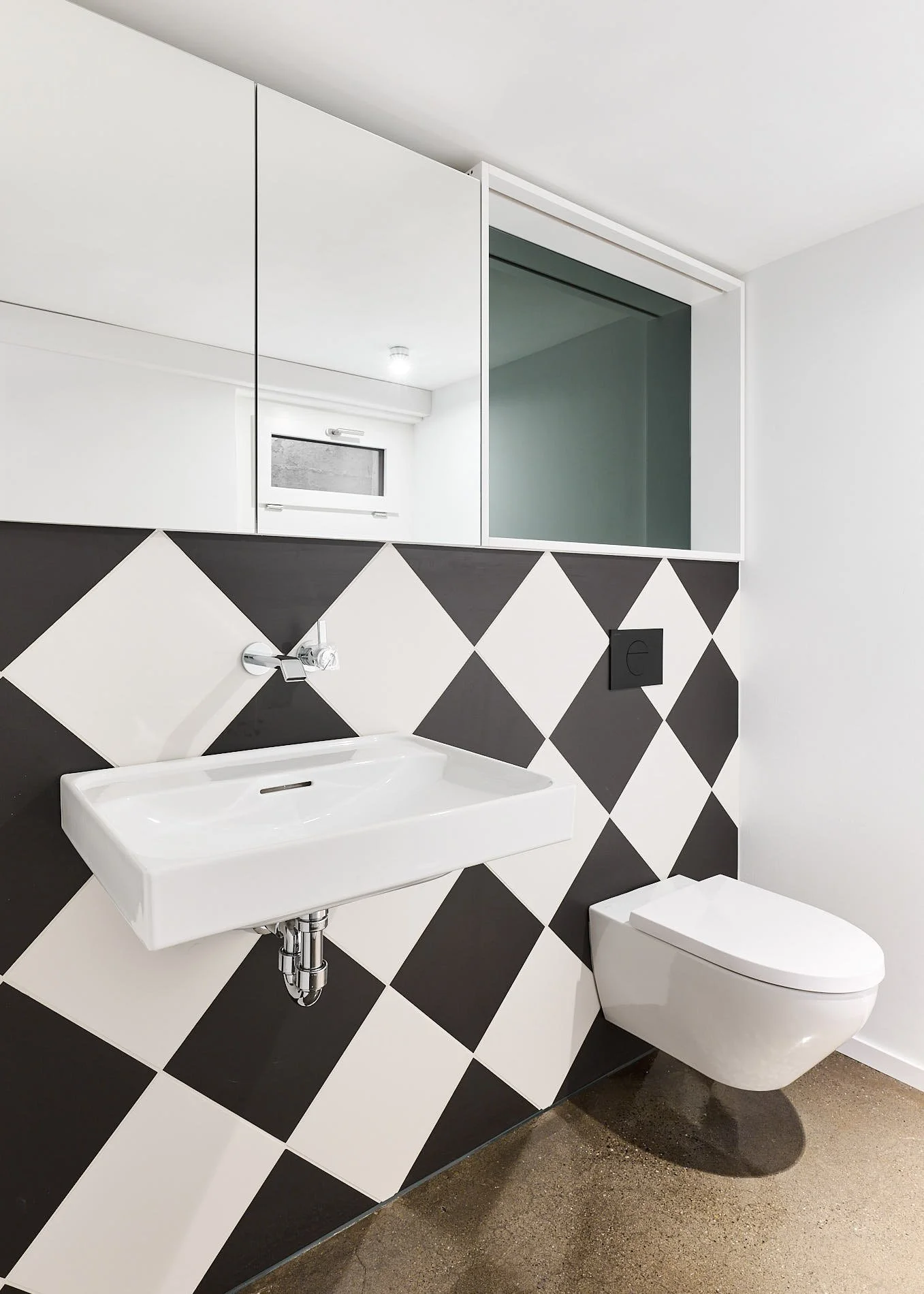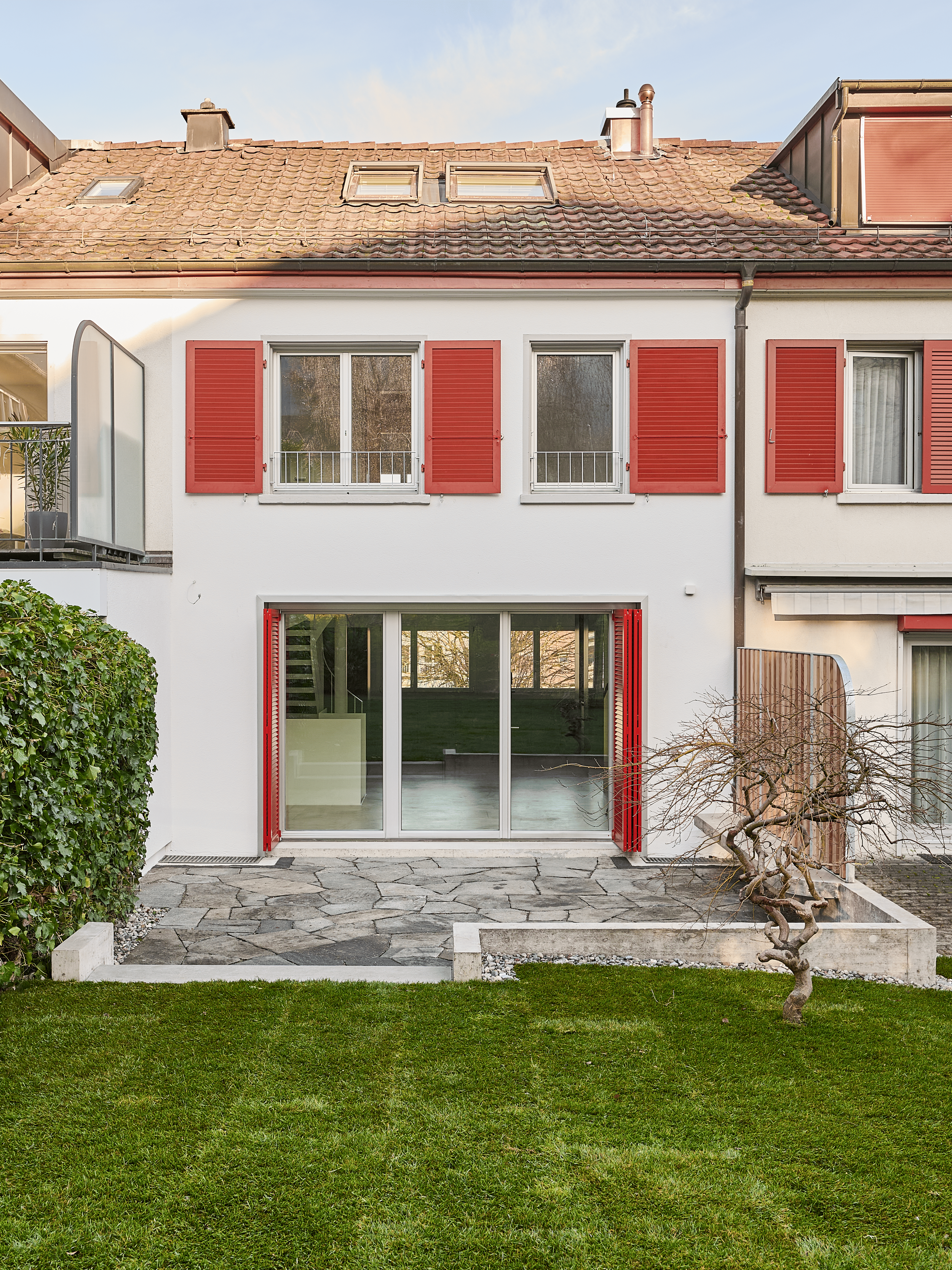 An der Südfassade reagiert die Öffnungsstruktur auf die neue innere Disposition. Ein verbreitertes Fenster im Erdgeschoss stärkt die Beziehung zum Garten und verbessert die natürliche Belichtung der Haupträume, ohne die tektonische Ordnung der Reihenfassade zu unterlaufen. Im rückwärtigen Bereich fassen Monobetonelemente die Aussenräume und bilden zusammen mit den innenräumlichen Eingriffen eine klare Sequenz von Eingang, Wohnen und Garten.