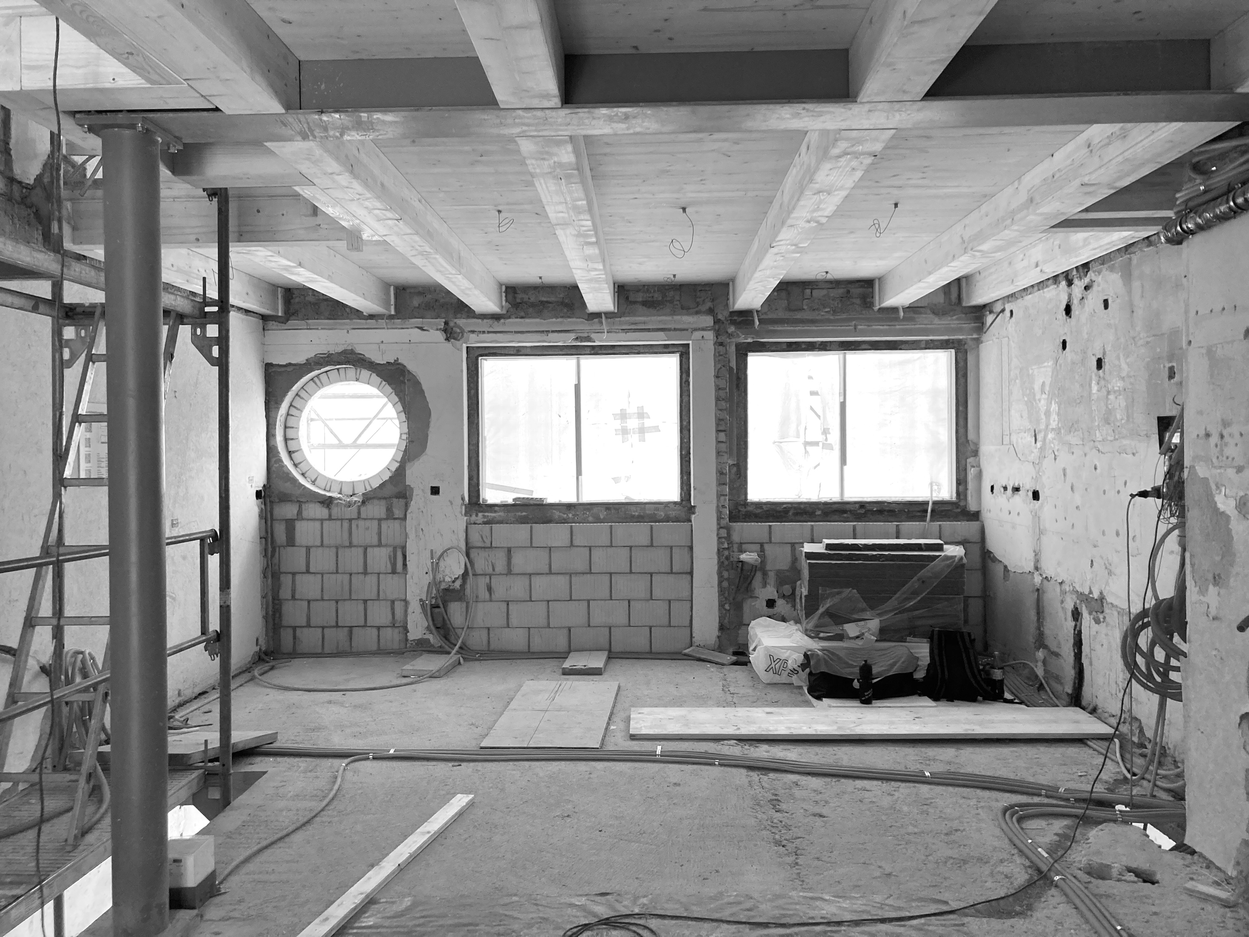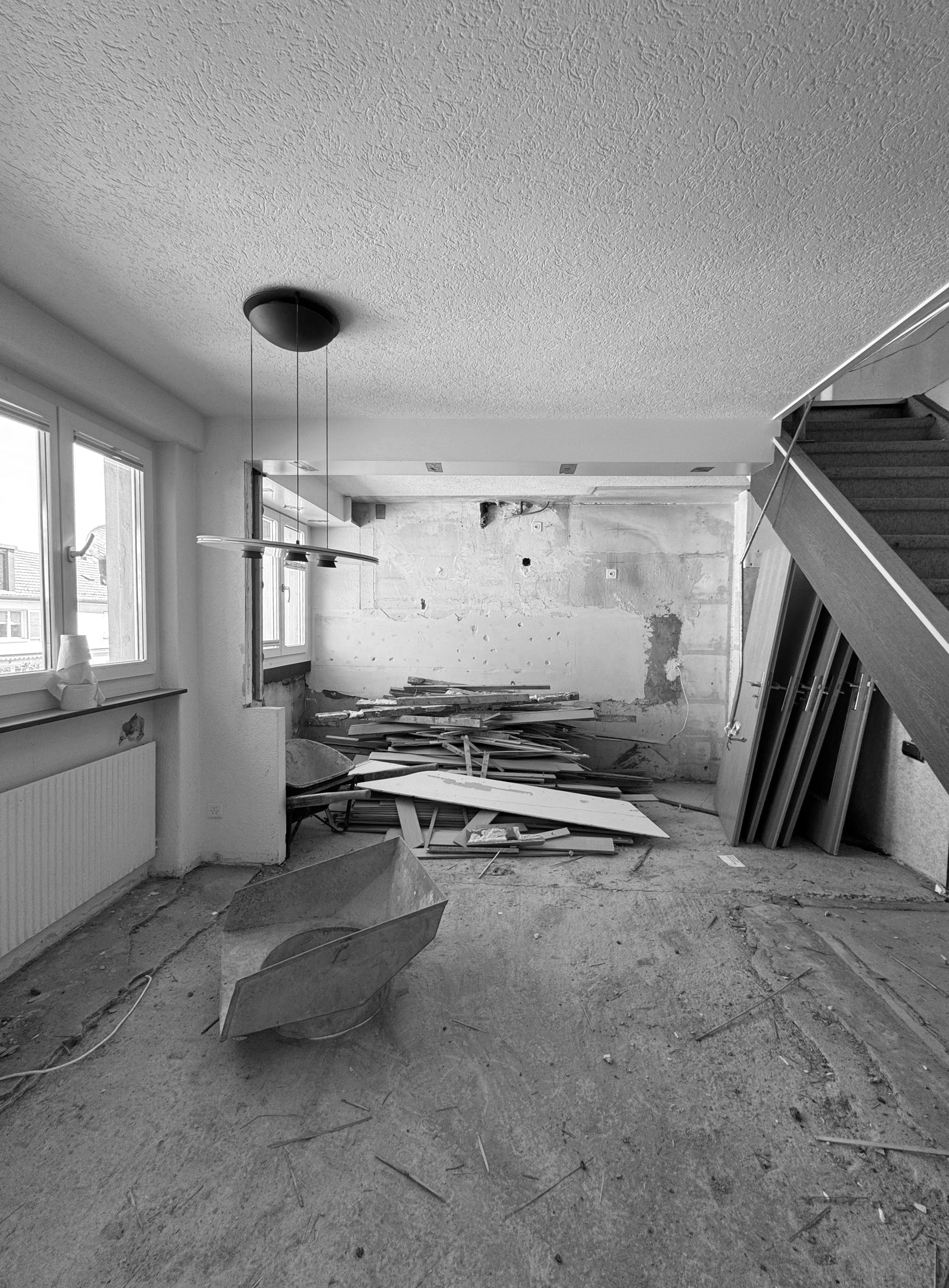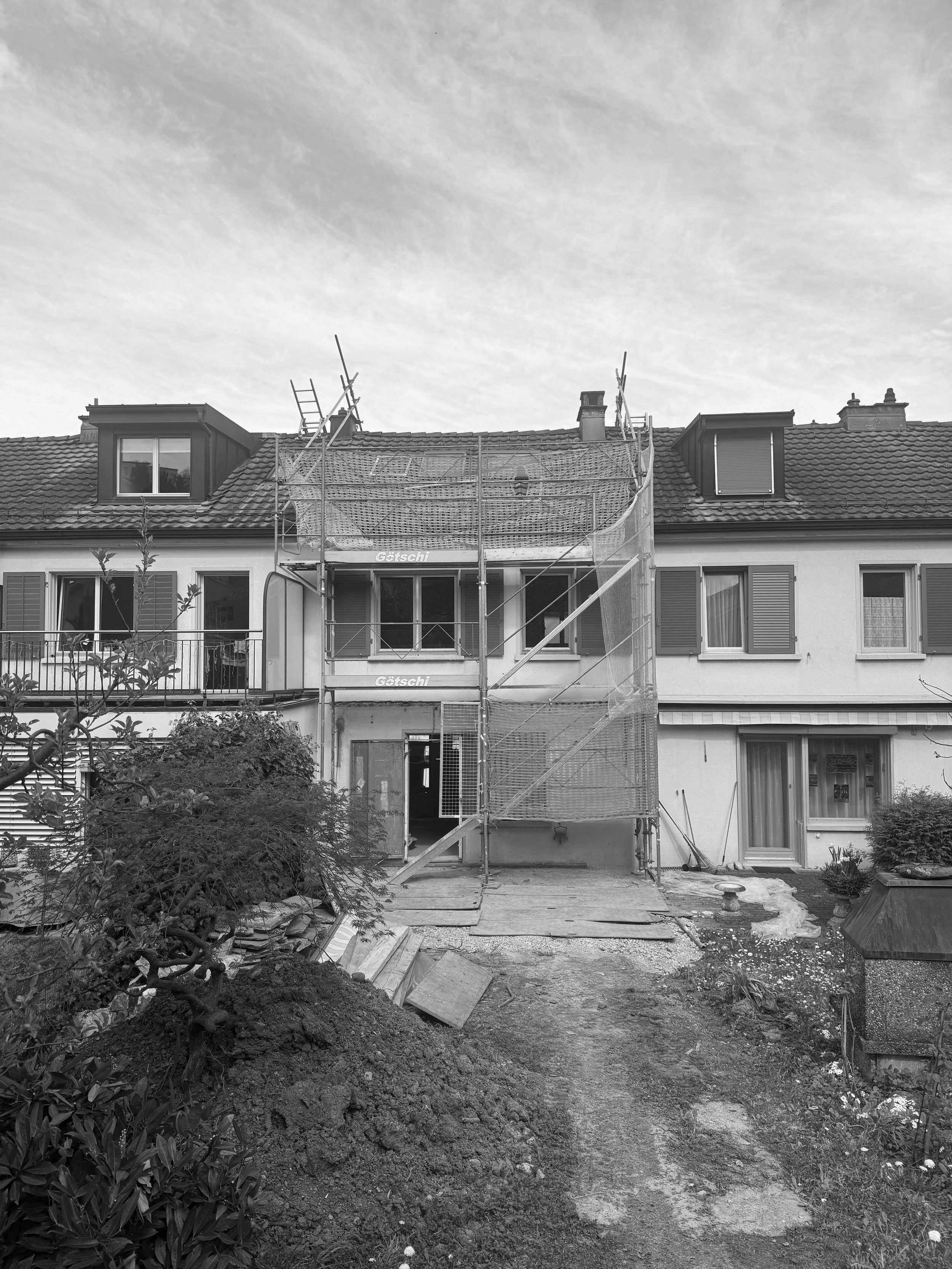 Das 1932 erstellte Reihenhaus wird zwischen Februar 2024 und Dezember 2025 in mehreren Etappen bis auf die tragenden Bauteile zurückgebaut und baulich, räumlich sowie energetisch auf einen zeitgemässen Stand gebracht. Im Erdgeschoss ersetzt eine neue Stahlbetonbodenplatte die bestehende Konstruktion. Teile der alten Hourdisdecken werden entfernt und durch neue Geschossdecken in Holzbauweise ergänzt. Gleichzeitig werden Küche, Bad und Gebäudetechnik vollständig erneuert, sodass das Haus konstruktiv und haustechnisch faktisch einem Neubau im Bestand entspricht.