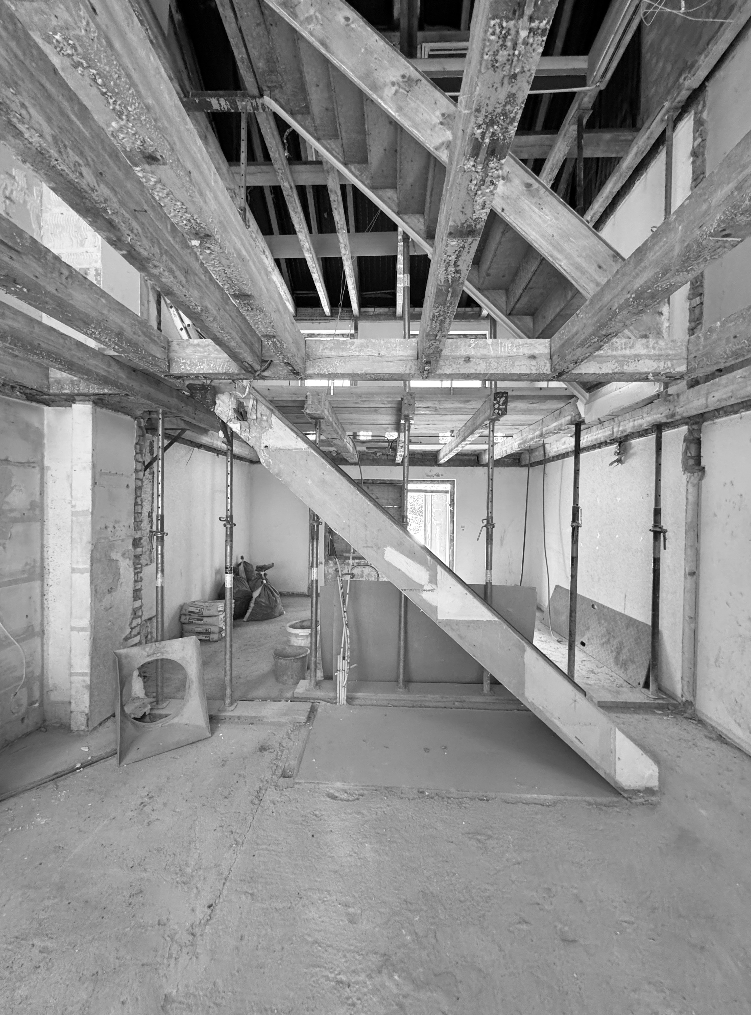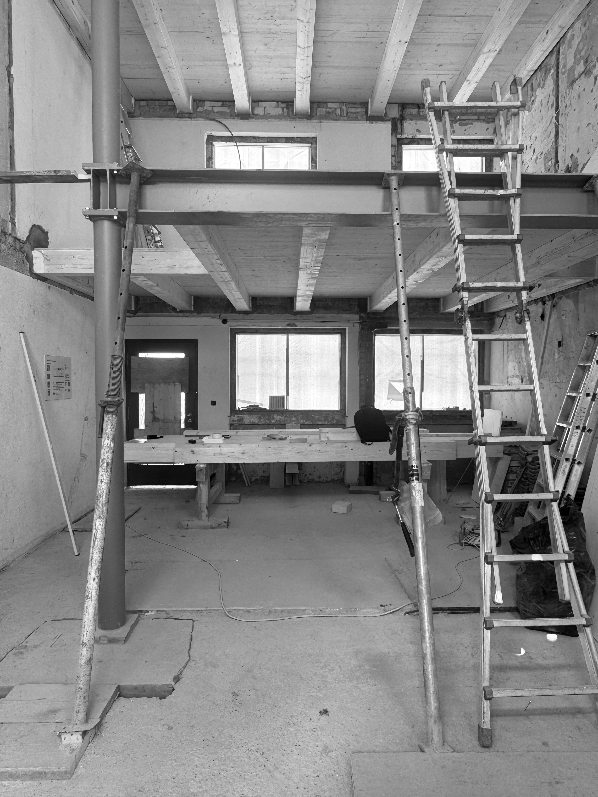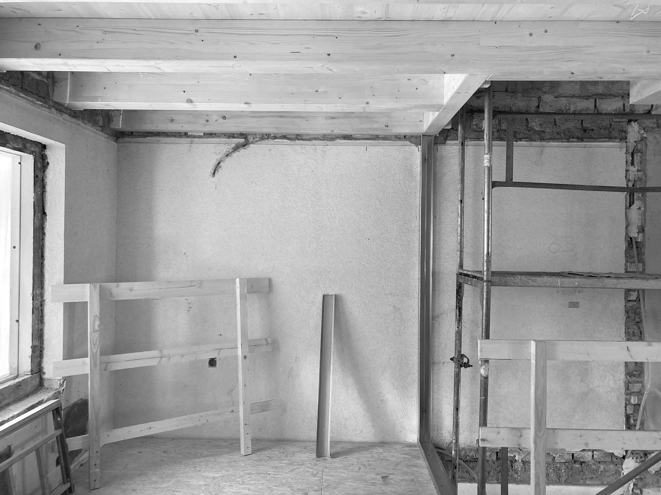 Das 1932 erstellte Reihenhaus wird zwischen Februar 2024 und Dezember 2025 in mehreren Etappen bis auf die tragenden Bauteile zurückgebaut und baulich, räumlich sowie energetisch auf einen zeitgemässen Stand gebracht. Im Erdgeschoss ersetzt eine neue Stahlbetonbodenplatte die bestehende Konstruktion. Teile der alten Hourdisdecken werden entfernt und durch neue Geschossdecken in Holzbauweise ergänzt. Gleichzeitig werden Küche, Bad und Gebäudetechnik vollständig erneuert, sodass das Haus konstruktiv und haustechnisch faktisch einem Neubau im Bestand entspricht.